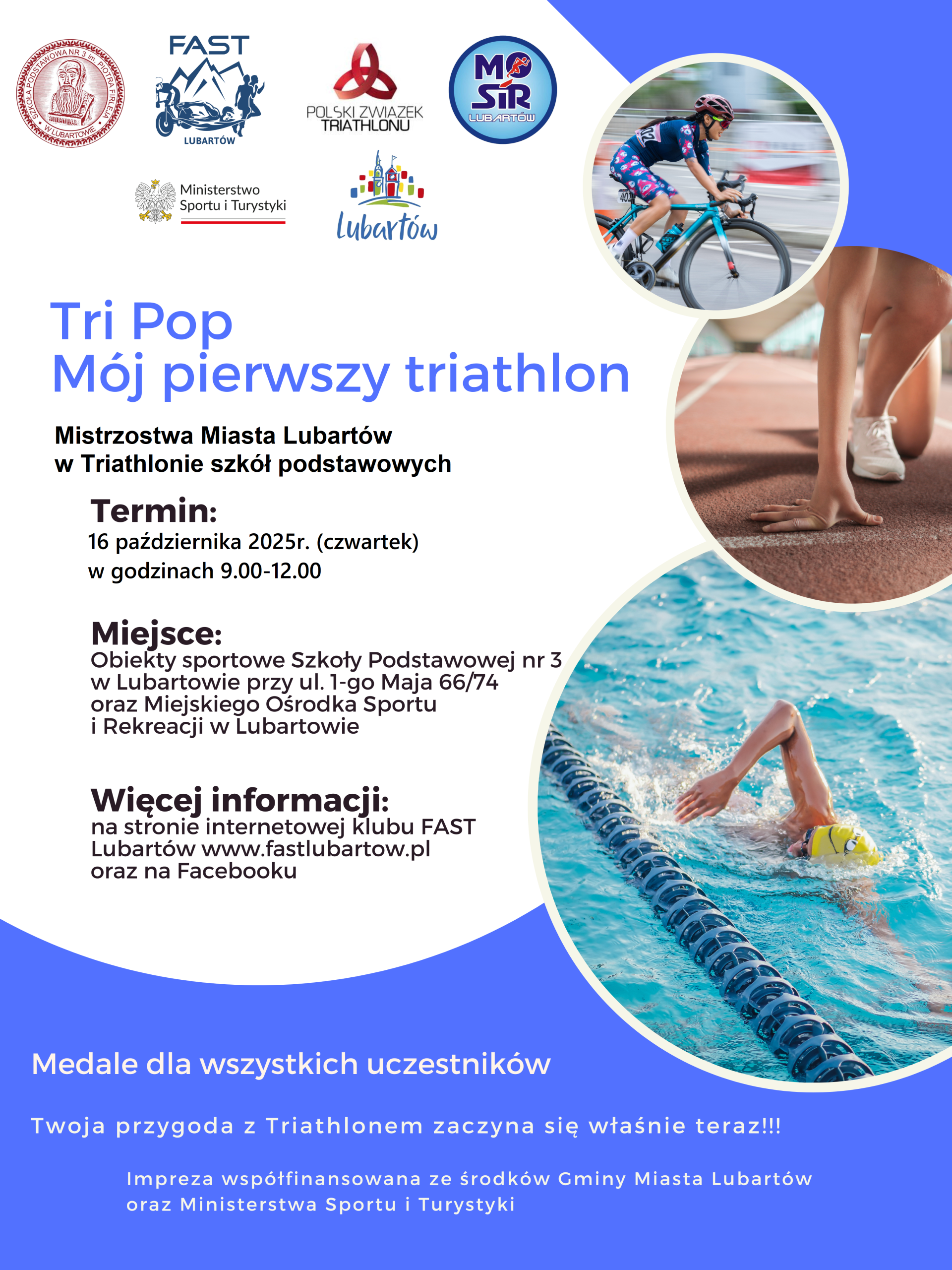 Forum Aktywności Sportowo-Turystycznej FAST wspólnie ze Szkołą Podstawową nr 3 im. Piotra Firleja w Lubartowie oraz Polskim Związkiem Triathlonu serdecznie zapraszają na „Mój pierwszy triathlon – Mistrzostwa Miasta Lubartów w Triathlonie szkół podstawowych”. Impreza odbędzie się w dniu 16 października 2025r. (czwartek) w godzinach 9.00-12.00 na hali sportowej w Szkole Podstawowej nr 3 w Lubartowie.